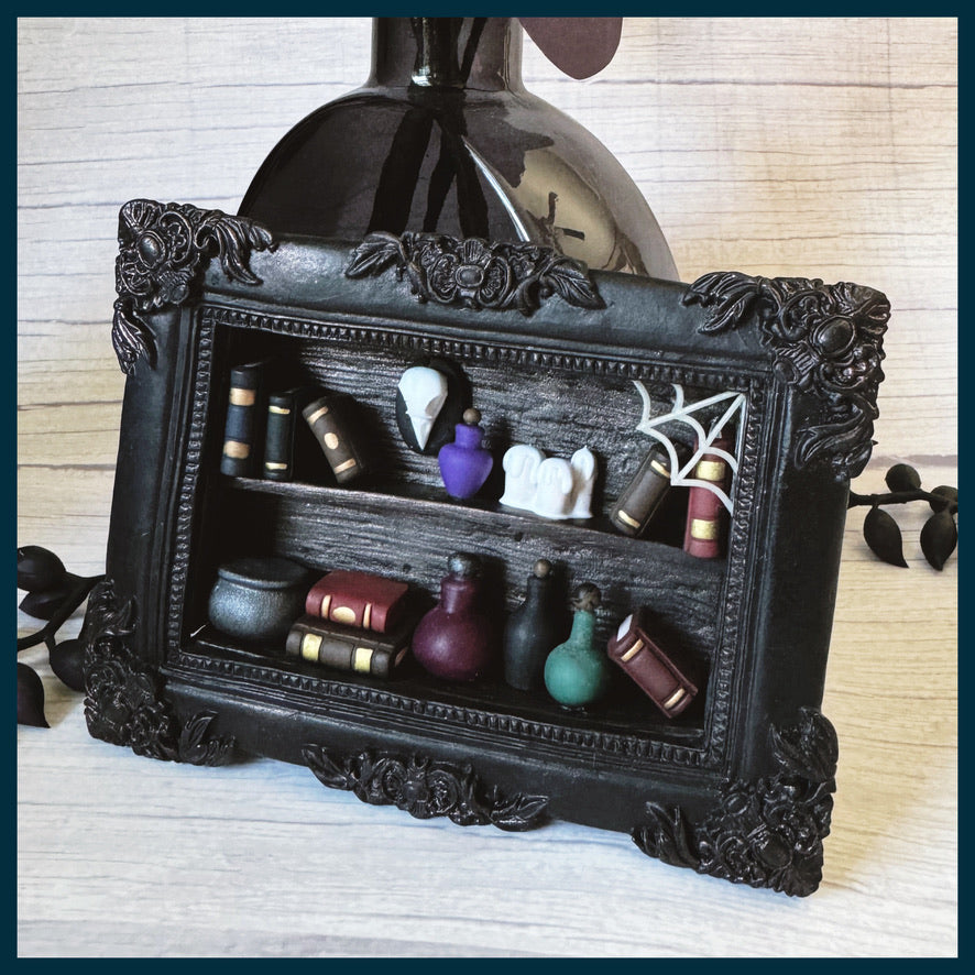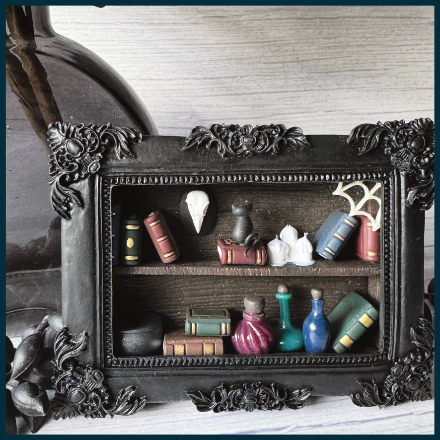 These little oddities are made entirely of polymer clay. Including the frame! Each one will be different. Different color books and bottles. Maybe there will be a cat, maybe not. If you have strong feelings about a particular item, leave me a note with your purchase!